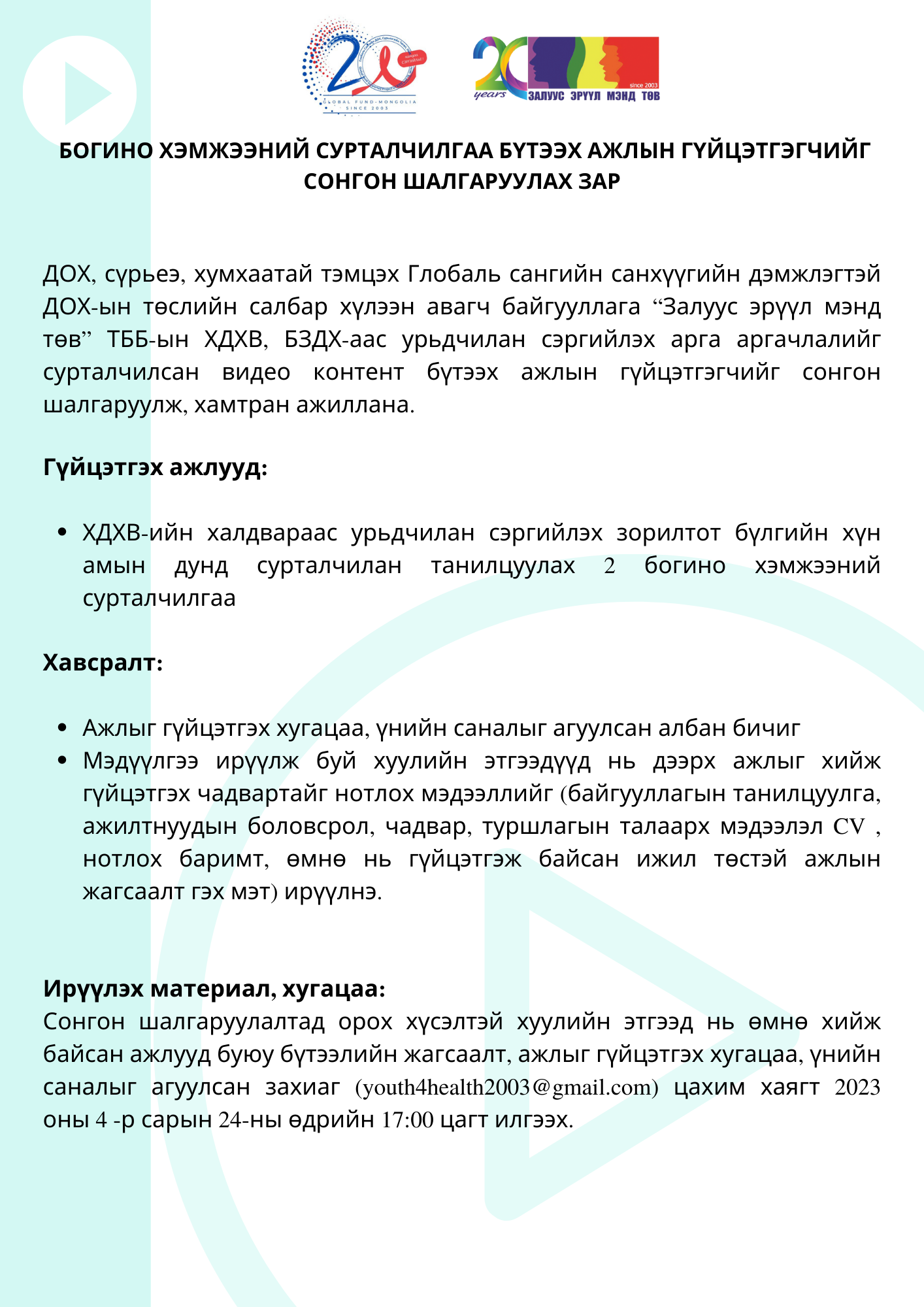 БОГИНО ХЭМЖЭЭНИЙ СУРТАЛЧИЛГАА БҮТЭЭХ АЖЛЫН ГҮЙЦЭТГЭГЧИЙГ СОНГОН ШАЛГАРУУЛАХ ЗАР